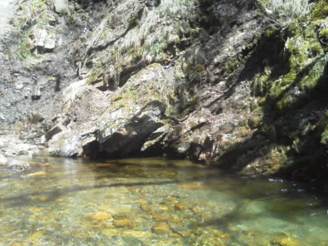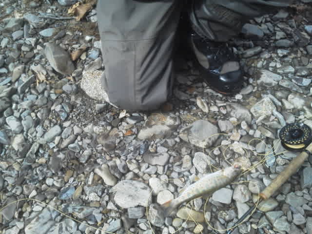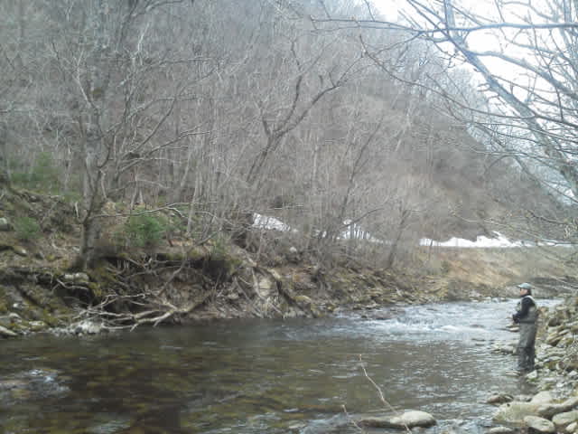 左の護岸際で尺超え岩魚をゲットするも・・・写真を撮る前にお帰りに